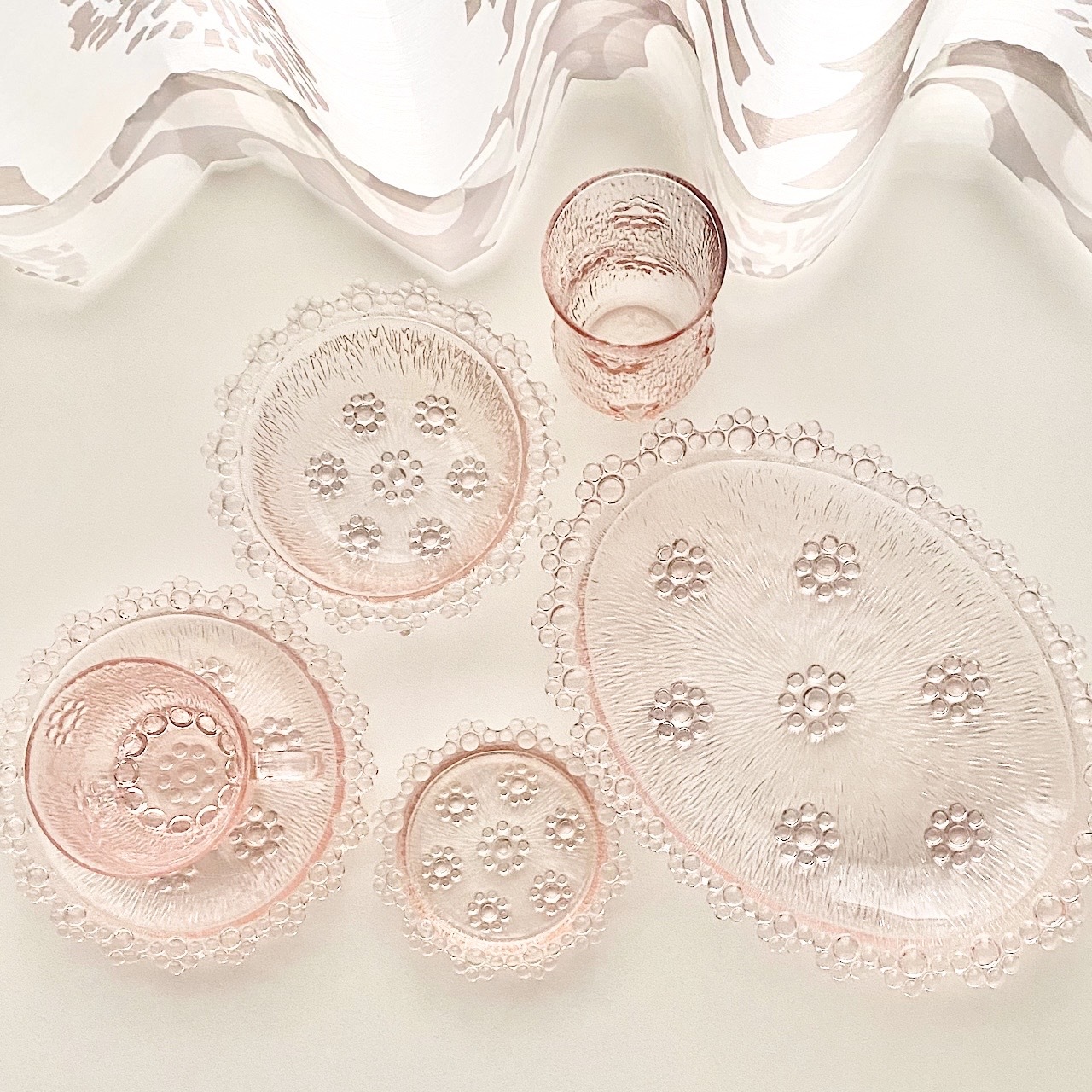 レトロ可愛い花模様。表面がザラザラとしていて滑りにくく使いやすいため長く愛用できます。グラス、プレート、ボウルなど様々な種類があり、そろえる楽しさもあります。